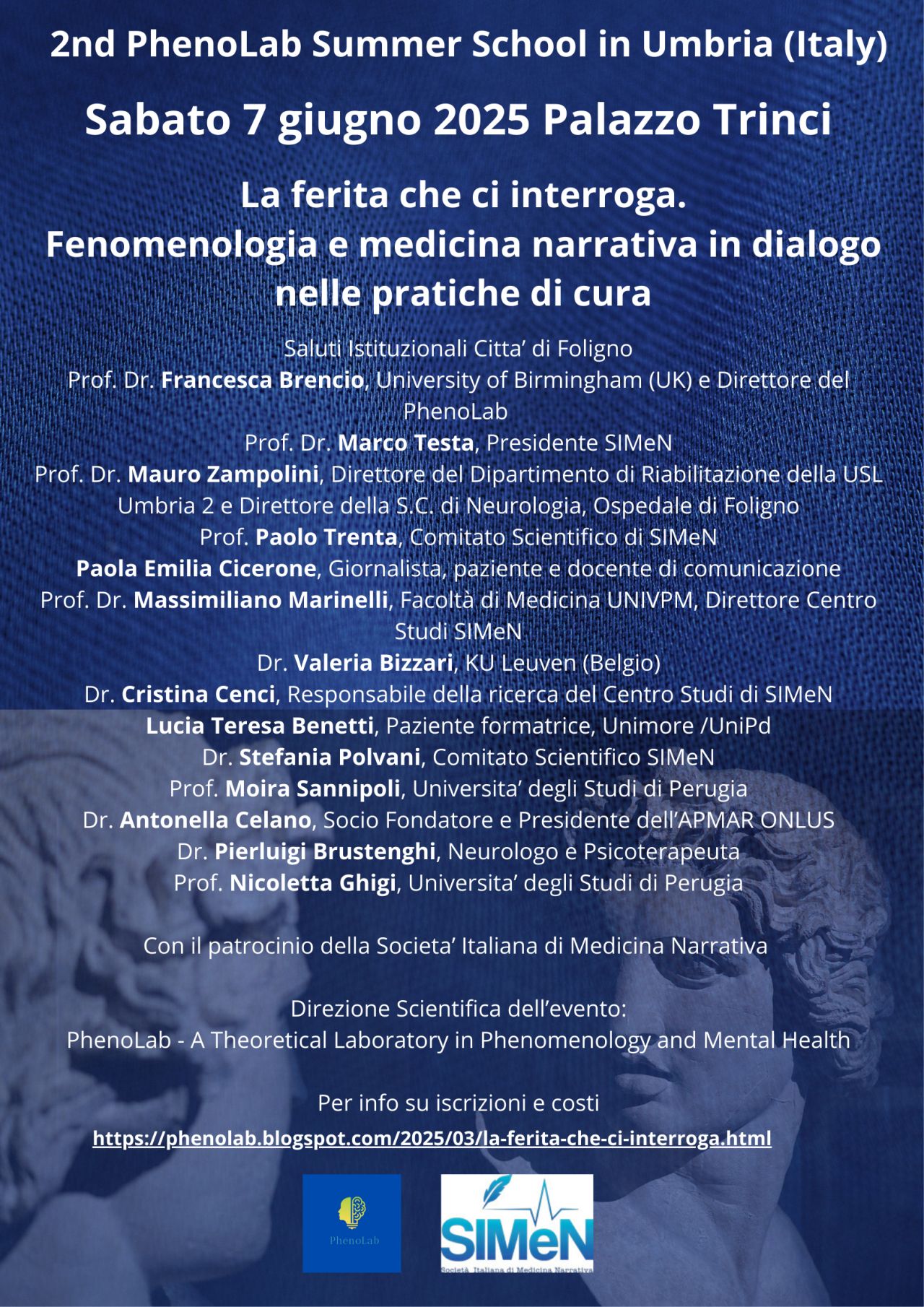 In occasione della 2nd PhenoLab Summer School in Umbria, il PhenoLab è lieto di annunciare un side event in lingua italiana dal titolo “La ferita che ci interroga. Fenomenologia e medicina narrativa in dialogo nelle pratiche di cura”. L’evento si terrà sabato 7 Giugno a Foligno, presso Palazzo Trinci.