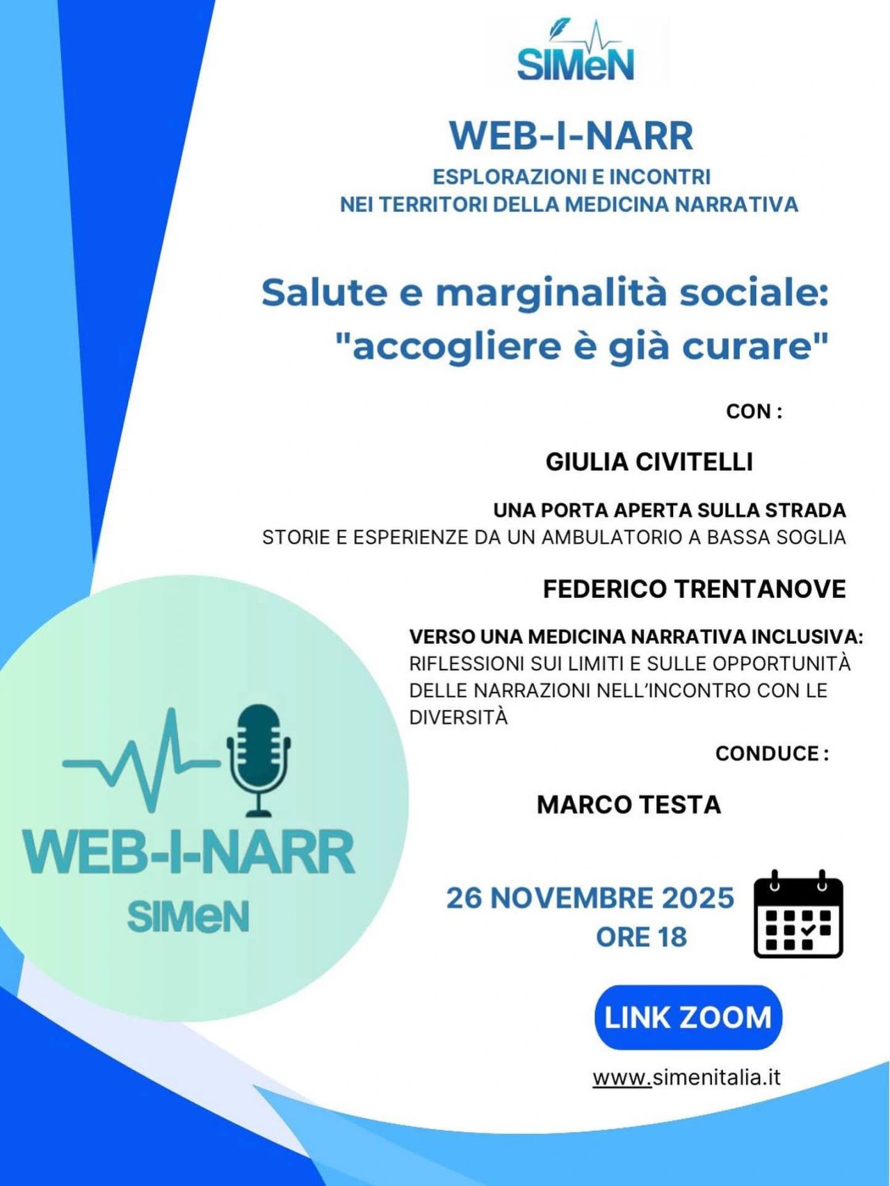 Mercoledì 26 novembre alle ore 18 si terrà il secondo Web-I-Narr organizzato online dalla Società Italiana di Medicina Narrativa (SIMeN) dal titolo “Salute e marginalità sociale: accogliere è già curare”.